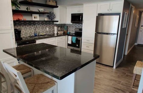 Newly remodeled with granite counters, all tile floors, super fresh & new. Kitchen, decor/furnishings all in fantastic taste