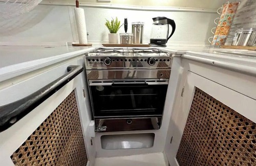 - Cooking: the kitchen has an old school alcohol stove to brew your coffee or cook a nice meal.