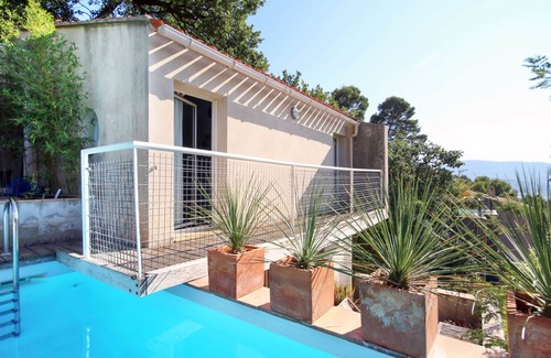"Sainte Claire", 5-room house 150 m2 on 3 levels. Bright, comfortable and tasteful furnishings: living/dining room with panoramic window with open-hearth fireplace, dining table, satellite TV, hi-fi system and air conditioning. Exit to the terrace. 1 room with 2 beds (90 cm, length 190 cm). 2 rooms, each room with 1 bed (90 cm, length 190 cm). Exit to the balcony. Open kitchen (oven, dishwasher, 4 ceramic glass hob hotplates, toaster, kettle, microwave, freezer, electric coffee machine). Exit to the terrace. Bathroom, sep. WC. On the lower ground floor: Studio with 1 french bed (140 cm, length 190 cm), dining table and bath/WC. Exit to the terrace. Small kitchenette (2 hot plates). Upper floor: open gallery with 1 french bed (160 cm, length 190 cm). Electric heating. Terrace, south-west facing position, patio. Terrace furniture, electric barbecue, deck chairs (2). Beautiful view of the garden, the countryside and Hyères. Facilities: washing machine, iron, children's high chair, baby cot. Internet (WiFi, free). Maximum 2 pets/ dogs allowed. No internal connecting door between the separated properties. When there are less than the maximum number of guests staying at the property, not all of the housing units will be available for use. When there are less than the maximum number of guests staying at the property, not all of the bedrooms will be available for use. Instead of an enclosed bedroom, some sleeping areas are located in an open-plan area (gallery, alcove, etc.).