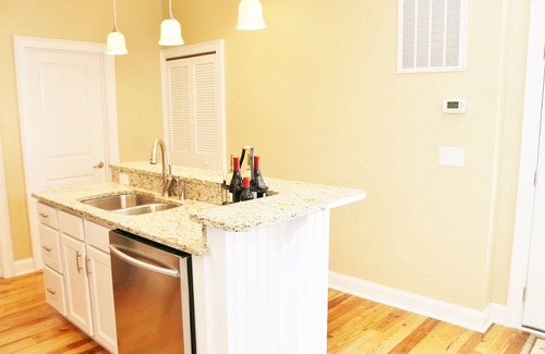- Fully stocked kitchen with granite countertops and high-quality appliances, including pots, pans, utensils, a coffee maker, and spices