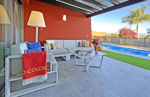 Elegant two bedroom house located on the golf course of Salobre renovated and stylishly decorated, with a magnificent covered terrace and a large private pool.