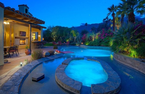 Desert living is best experienced outdoors with the estate's lagoon-shaped salt-water pool with inlay spa and tanning shelf. The grounds also include an outdoor bar and grill area perfect for dining al fresco or sipping beverages while the chef in the group grills gourmet meals. In addition to the grill, the bar features a fireplace and wall-mounted flat-screen TV (Outdoor TV Only Available to Rentals of 28 Nights or longer per city ordinance). Incredible views of Mt. San Jacinto, a private outdoor shower, fire pit, multiple bubbling fountains, spacious grass area, five lounge chairs and a covered outdoor dining area with misters complete the outdoor space.