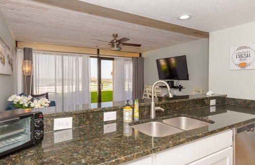 Welcome to unit #101 - Salty Pelican, a one-bedroom, one-bathroom condo that is set with bay views located on the first floor. This condo is pet friendly for 1 pet only and under 25 lbs. You cannot beat the amazing views of Aransas Bay from the large picture windows or relax on the patio with a glass of wine and take in the cooling bay breeze. This cozy condo has a king-sized bed, a queen-sized sleeper sofa in the living room, and wonderful beachy decor.