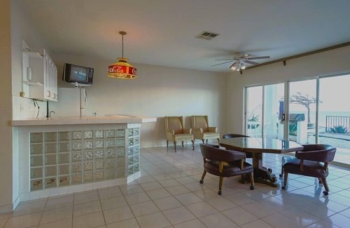 From the back patio of this gorgeous waterfront estate, you can see the sandy beaches and crystal-clear waters of the Sea of Cortez. The gorgeously tiled back patio leads right out to the beach and has a gorgeous water statue, beach chairs, and patio seating to enjoy. Inside, a wide-open living room is complete with one plush leather sofa, a comfortable armchair, and recliner. There is a large flat screen TV mounted on the wall that gets all of your favorite channels. There is a half bathroom located right off of the living room for your convenience. This is also where you’ll find a washer and dryer so that you can keep up with laundry while you are here.