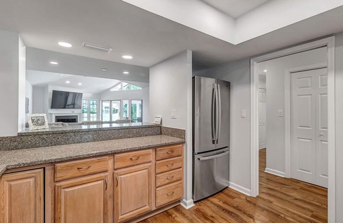 The open layout invites relaxation with vaulted ceilings, oversized windows, and a flat-screen TV. A cozy fireplace anchors the living room, while the enclosed sunroom provides a peaceful spot to take in panoramic golf course views throughout the day.