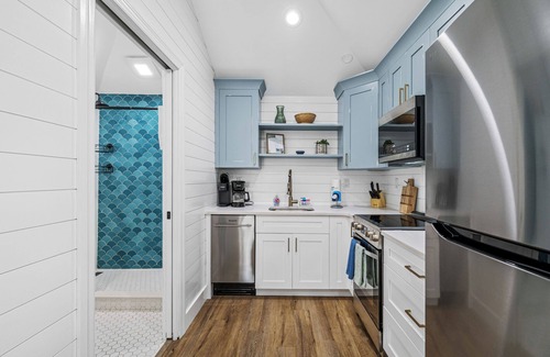 The fully equipped kitchen features modern appliances, cookware, and utensils to make meal preparation a breeze. Including Stainless steel appliances, cooking basics, spices, dishware & flatware, a knife set, a Keurig coffee maker, a blender, and more!