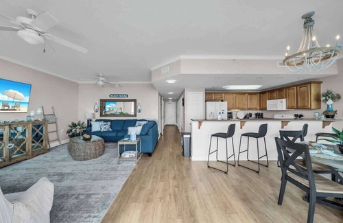Inside, the vibe is coastal cool with an open, sunlit living space decked out with floor-to-ceiling windows, comfy seating, and a big-screen TV for unwinding after a full day of wave-chasing. The fully stocked kitchen has everything you need to whip up a post-beach feast, featuring granite countertops, classic cabinetry, and all the essentials to keep the crew fueled.