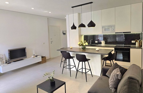 The apartment has an airy open-plan living space, which is stylishly decorated with contemporary pieces. There is a large sofa, a flat-screen TV and a breakfast bar for quick snacks. The modern kitchen is well-equipped, with a cooker hob, oven, dishwasher, Nespresso coffee machine and fridge/freezer.