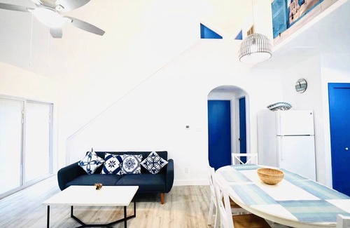 Inspired by our trip to Santorini island, the cottage is decorated after the cave houses on the Greece Island. The distinct blue and white bring the Santorini style to your stay. The cottage has a fenced-in yard with a dome gazebo. It is a welcoming place for a traveling family of two, or add two small kids and their furry friends.