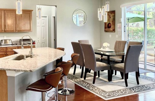 Our happy place is a independent house, features 4 bedrooms (sleeps 8 comfortably), 2.5 baths, stainless steel appliances, a fully equipped kitchen, private and screened Pool & Spa, pool deck with loungers, dining table and chairs.