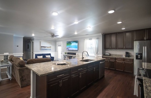 The open concept kitchen and living room area provides a dining table with seating for 6 as well as a large kitchen island with 6 bar stools. The kitchen is well stocked with serving, cooking, and baking dishware and utensils and there is ample cabinet space reserved for guest food storage. The coffee station has a Keurig, French press, and coffee grinder. The living room area has a large sectional couch as well as 4 additional upholstered chairs for casual seating. There are Roku TVs in all bedrooms, the living room, and outside under the covered patio. Please note that local cable is not provided. Guests can log in to their personal subscription services (i.e. Netflix) or the Roku Channel offers live television news from a variety of national stations and a wide variety of complimentary movies, sitcoms, children's shows, or documentaries. A full-size laundry room with bench connects the kitchen and master bedroom and is equipped with a full-size washer and dryer and plenty of pool towels for guest use.