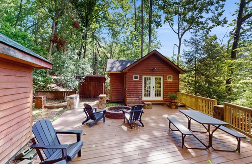 A pleasant wilderness retreat awaits you and yours at these Horse Shoe, North Carolina cabins! As soon as you step inside the main cabin, the rustic ambiance will have you feeling right at home. Cozy up in front of the living room's wood-burning fireplace before utilizing the well-equipped kitchen to prepare something tasty. After you've indulged your cravings, gather around one of the tables for a board game night or a round of cards. The second cabin displays a studio living space with a full bathroom, electric fireplace, and kitchenette with a microwave, coffee pot, and mini fridge.