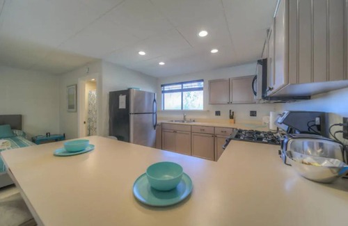 - Unit #3 is a downstairs studio with full kitchen and bathroom. Living area has couch with sofa bed, and tv with firestick. Main bed is a queen. Bathroom has shower. Kitchen has refrigerator, stove, and all basics. Dining area has table for 4. Has small desk as workstation.