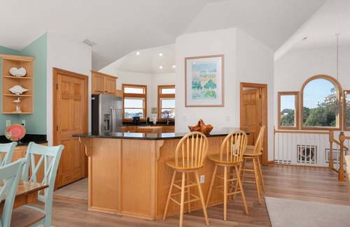 On the 3rd floor, you will find the Great Room with expansive views, cathedral ceilings, and a buttery yellow leather sectional with two seating areas for reading and watching tv. The fireplace is available year round. The dining room seats 12 with 4 additional seats at the bar. The kitchen is stocked with good pots and pans for those family meals, two dishwashers, plenty of dishes, and so much more. This floor also has a half bath and the main King Ensuite bedroom with a chair, TV, and a large full bathroom boasting a jacuzzi tub as well as a shower. On the deck are a table and chairs for picnicking and lounging chairs with incredible views of the ocean.