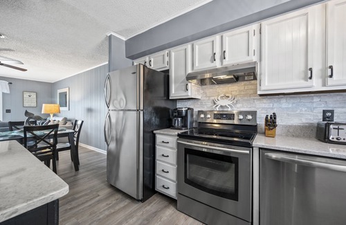 The Living Area opens up to the Dining Area with seating for 4, plus 2 seats at the Custom Kitchen Island. No need to dine out every day with this incredibly well-stocked Kitchen - unless you want to, that is! If dining out is your thing, you’re just a short stroll from many fine Dining options, as well as shops and amusements, such as Jolly Roger Amusement Park. With Gleaming Granite Countertops, Stainless Appliances, and rustic Coastal Touches throughout, mealtime will be a bay breeze.