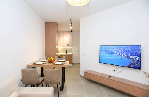 The apartment in Vlorë has 1 bedrooms and has capacity for 4 people. The apartment is nice, has new furniture, and is 48 m². The property is located 0 m from the sand beach. The house is situated in a family-friendly neighborhood next to the sea .The accommodation is equipped with the following items: washing machine, dryer, iron, safe, internet (Wi-Fi), hair dryer, balcony, air-conditioned, open-air parking the same building, 1 TV . In the hotplate of glass ceramics open plan kitchen, refrigerator, microwave, oven, freezer, dishwasher, dishes/cutlery, kitchen utensils, coffee machine, toaster, kettle and kitchenware are provided.