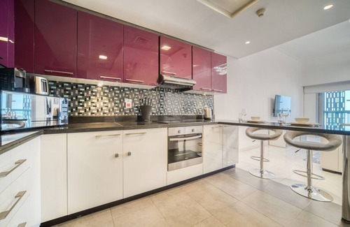 Starting from a fine-curation of an open-floor plan, this holiday apartment accommodates everything you look for in a short-term getaway in Dubai. Each aspect of everyday life carefully catered to with the all-inclusive perks of utility charges, fully-equipped kitchen space and home appliances. With sophisticated notes of deep purple and classic neutrals, the home paints the perfect ambience for young professionals, couples and solo travelers in the city to get into the groove of the city’s fast-paced urban lifestyle. The spacious living area also extends to accommodate a high-floor balcony space featuring 360 views of the entire district. Moreover, many of the area’s vibrant entertainment and leisure outlets also lie within moments away, providing the perfect opportunity to spruce up your weekend itinerary.
