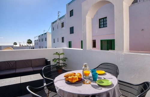 Flirtatious holiday home located in a quiet complex in Puerto del Carmen, close to the main avenue and all services. Communal swimming pool, fibre WiFi, spacious terrace with view and chill out area: ideal for couples!This holiday home is perfect for those looking for a strategic base to visit the island of Lanzarote and, at the same time, enjoy a relaxing holiday by the pool.Casa Sea Waves is located very close to the centre of Puerto del Carmen, the most well-known town on the island. From here you can easily reach all the main tourist centres of Lanzarote, as the town is located in the centre of the island. In addition, the Avenue of the Beaches - with its restaurants, shops and bars - is just a 10-minute walk from the property, as well as Playa Grande, the main beach of Puerto del Carmen.The house is located on the first floor of the complex (accessible by stairs) and has a spacious and beautiful terrace equipped with a dining table, chairs and an umbrella, with views of the pool and chill out area. The bedroom has two single beds that can be joined if necessary, as well as a ceiling fan to cool down during hot summer days. Sheets and towels are provided (1 large and 1 small per person). Bathroom with shower.The kitchen is equipped with a microwave, coffee maker, ceramic hob, water boiler and kitchen utensils. The community swimming pool is available to guests, as well as sun loungers.Sea Waves is located in a strategic position in Puerto del Carmen: from here you will arrive in a short time to beaches, restaurants, shops and bars, without the need to rent a car or other means of transport. The nearest supermarket is just 50m away and you can easily park on the same street of the complex.The changing of sheets and towels has an extra cost.Cot available upon request.WiFi with fiber.