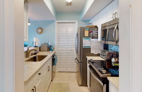 The comfortable living area features wood flooring, quality sofas, a large SMART Roku TV and high speed Comcast WIFI to stream all your favorite shows on Netflix and Amazon! The main living area sofa pulls out into a sleeper sofa for extra guests. The kitchen includes beautifully upgraded appliances for home-cooked vacation meals. For added convenience and easy packing, a high quality washer/dryer is just off the kitchen.