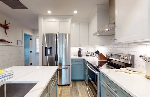 The living area features rich, warm earth tones with brand new wide plank luxury vinyl wood flooring and shiplap walls offering the feel of a home rather than a villa. Enjoy engaging evening entertainment with a large, wall mounted 55” Smart TV to stream your favorite programs with your Netflix, Amazon or other streaming accounts. The all new interior features a brand new chef's kitchen anchored by a center island with bar seating with stylish upgrades including Calacatta Gold Quartz countertops, beautiful custom cabinetry and a Keurig for coffee lovers.