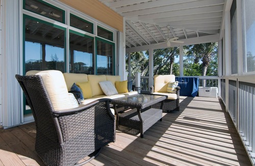 Soak up the scenery, relax, and unwind during your peaceful vacation at Seaclusion (4BR/4BA; Sleeps 10: 1K, 2Q, 1D, 2S), located in exclusive Jeremy Cay. Nestled beneath Lowcountry palmettos and live oak trees, you'll have a front-row seat to the sights and sounds of the Atlantic Ocean and the famous ACE Basin. Whether you enjoy boating, bird watching, crabbing, fishing, kayaking, or just a spectacular view of Edisto's beauty, the vantage points from the expansive screened-in porch, top floor sundeck, and shaded ground floor covered patio are nothing short of awe-inspiring. Spend your days searching for endless treasures and splash in the waves on the two-and-a-half miles of private Edingsville Beach which can be accessed just a stone's throw from your doorstep. From your private dock located on the tranquil saltwater lagoon, you can take in exceptional scenery comprised of Great Blue Herons, gulls, and more flora and fauna than you could describe while testing your fishing/crabbing skills and taking pride in dining on your very own fresh catch. The beauty continues indoors with a spacious living/dining/full kitchen combination featuring comfortable furnishings, beautiful granite countertops, and top-of-the-line appliances to ensure your friends and family are entertained in style! Magnificent hardwood floors, exposed wood beams, and custom tile work will only enhance your unforgettable experience in exquisite Edisto luxury. The cozy sleeping quarters are self-contained with an open ceiling to continue the post and beam design throughout the home. Even though you will feel miles away, satellite TV and free WiFi are available just in case a brief after noon shower interrupts your fun in the sun. Restaurants, shops, and the Plantation Golf Course on Edisto Beach are just a short five-mile drive away. Treasure your time on Edisto! No Smoking. No Pets.