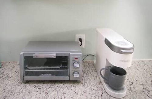 Appliances include a fridge/freezer, stove, oven, dishwasher, microwave, Keurig coffee maker, toaster, and blender. The cabinets are stocked with cookware, dishes, glasses, and a filtered water dispenser to ensure everybody stays hydrated.