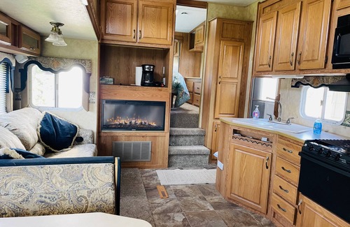 5th wheel has 2 bedrooms, new flooring, fireplace, sleeps 10. Located on scenic country acreage close to town and a short drive to local attractions. Master has double closets, storage, and queen bed. Back room has queen bunks, closet, and storage. Living area includes sofa sleeper and convertible table. Full kitchen with micro, fridge, double sinks, and three burner stove. Bathroom with tub and shower. Includes games, outdoor table, fire pit, and cooler. Sleeps 8 adults and 2 children.