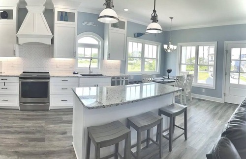 This beautiful home is located right across the street from the private community beach boardwalk. With chairs, towels, kayaks and beach toys provided - your beach vacation couldn’t get any easier!