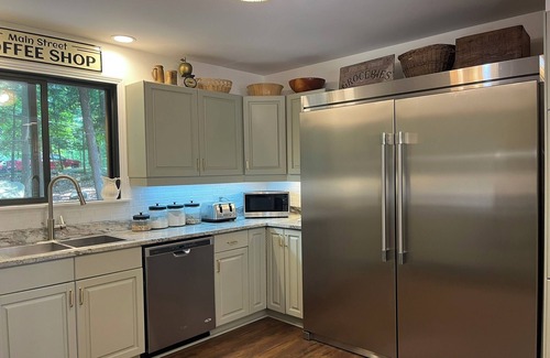 Evenings are made for laughter—shoot pool or play ping pong, sing around the piano, try karaoke, or work on a puzzle in the bright 3-sided Muskoka room. The fully equipped kitchen features Muskoka stone-inspired countertops, restaurant-size fridge and freezer, and everything needed for memorable meals—served indoors or at the outdoor table for 10, which is our max guest count.