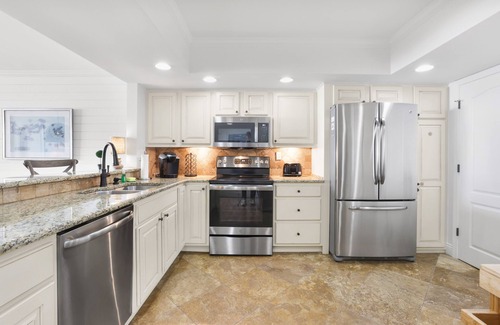 Prepare meals in the well appointed kitchen, equipped with stone countertops and a full suite of stainless steel appliances, (new refrigerator with water and ice dispenser on the door), all while having a view of the beach! Make use of the Keurig (K-cup) machine and sip morning coffee at the kitchen bar.
