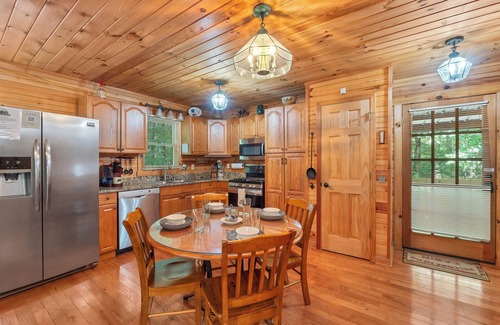 When walking in to the cabin, guests will enter the living room area. With comfortable reclining seating for up to 6, the living room is very welcoming. There is a wood burning fireplace as well as a flat screen TV with YouTube TV channels. The kitchen is just off of the living room with dining seating. It is fully equipped with all of the comforts of cooking at home.