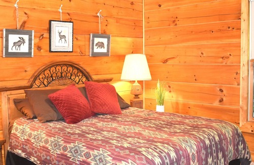 Nestled in a beautiful, private, wooded 10+ acre lot, Kap's Cabin has breathtaking mountain views. This 3 story charming log cabin is the perfect romantic get-away to enjoy relaxation and slow down while still having modern luxuries. The fully equipped kitchen features granite countertops, stainless steel appliances and is fully stocked with dishes, silverware, pots/pans, coffee maker, and more. A full size washer and dryer are at your fingertips, so no need to worry if you packed enough. Master bedroom on the main floor offers a comfortable queen bed, ceiling fan, TV in room and private bathroom with clawfoot soaking tub and shower. The master bedroom downstairs offers a queen size Casper bed, fireplace, ceiling fan and full walk in shower. The upstairs bedroom has a full size bed with 2 twin beds along with a sitting area and huge TV. There are 2 Family rooms and one with a 65" flat screen smart TV.