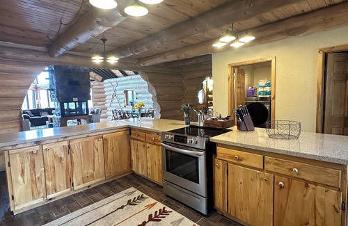 Step into the welcoming open-concept living area that blends modern amenities with beautiful furnishings, bathed in natural light that enriches the vibrant tones of the entire retreat. The spacious living area combines the fully equipped kitchen that opens to a tastefully furnished living room with a large stone fireplace that stands tall as a centerpiece under the majestic cathedral ceilings.