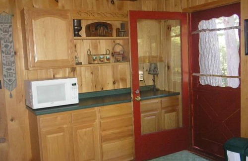 SKY ACRES LODGE itself provides you with over two thousand square feet of living area. The fifty foot porch has inviting Adirondack chairs, and the half that is screened contains a picnic table, although if you prefer there is an additional picnic table located outside. Upon entering the home you will be enchanted by the knotty pine interior, log beams and wonderful cathedral and vaulted ceilings. Listed below is a room-by-room description.