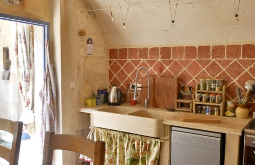 Adjacent to the main bedroom, small bureau and a veranda overlook the garden. The kitchen is well equipped with a gas range, electric oven, microwave, two fridges and dishwasher. There are stairs into the basement which has been converted into an overflow for the kitchen with a butler sink and stone worktops for food preparation, a washing machine and a freezer space. The house has internet, television gas heating and hot water.