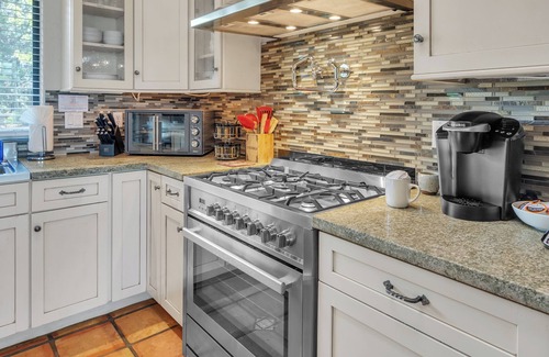 Kitchen: Features stainless steel appliances, including a gas stovetop, and ample counter space. The island seating for 3 makes this kitchen perfect for entertaining and casual dining. It's fully stocked with all the essentials needed to prepare a full meal, ensuring a seamless culinary experience.