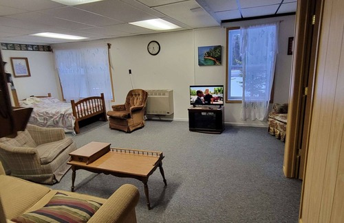2 bedroom, 1 bath (Standing shower), kitchen and living room. Each bedroom has a queen and a single bed and a single bed in the living room. Lots of parking for truck and trailer. Less than a minute walk from the bar and 2 minutes from the trails by sled or ATV/UTV. Truck to the trail head or leave from town. There is internet access and a smart TV. Minimal 3 nights.