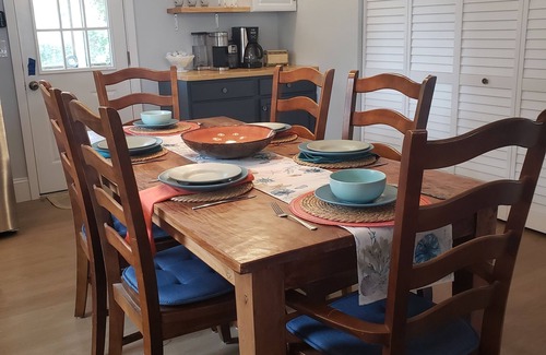 Three bedrooms, two baths, sleeps eight, (five adults and 3 kids, two queens, one twin over full bunk bed and a futon) with a primary suite with a private bath. TV with cable in the open concept living area, fully appointed brand new eat-in kitchen, deck with table and umbrella, screened-in covered porch with outdoor seating area. Bikes and helmets, beach chairs and beach umbrella, beach toys, propane gas grill, off-street parking for 3-4 cars, ceiling fans and tvs in all rooms, washer, dryer, dishwasher, unlimited Wifi included. Netflix available at no charge. Ten minute car ride from the bustling activities and fun of historic Cape May and fifteen minutes from the excitement-filled boardwalk in Wildwood. Sheets and towels not provided. Saturday to Saturday rentals from mid June to mid September (with some exceptions), occasional 3-4 night stays. This property and the surrounding area must be seen to be appreciated, come experience the natural beauty that abounds!!