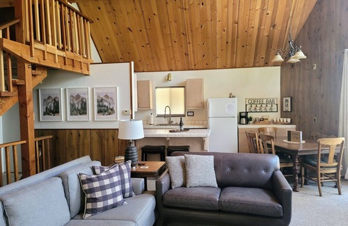 The living room has a stunning wall of windows letting in the natural light and boosts spectacular views of the grand Sierra Pines. It allows the outdoors to comes in. In the cooler evenings, light up a warm fire for those colder mountain nights! It is the perfect spot to relax and unwind in this "retreat" like getaway!!