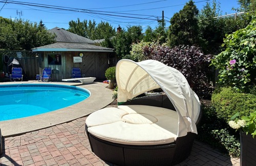 Welcome to Seraya Retreat —a cozy, wellness-inspired suite with private entrance and access to a dreamy backyard oasis. Enjoy 2 serene bedrooms, a full kitchen, a meditation den, and your own laundry. Step outside to a sun-soaked pool, lounge chairs, and lush greenery. Optional add-ons like airport services, Lebanese breakfast or breathwork sessions available. A peaceful, heart-centered Toronto stay awaits.