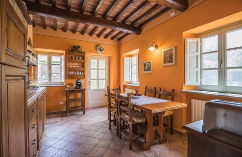 The house is divided into three floors. The style is rustic with wooden-beamed ceilings and terracotta floors. The decor is homelike and Tuscan.