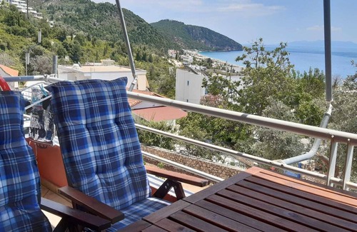 Spacious family room for four with amazing views of the Ionian Sea and the highest peak of Ceraunian Mountains, Mount Çika, as well. We welcome guests stay in our newly and completely refurbished apartment. It's got a good-size dining balcony, air-conditioning, wi-fi, satellite TV, kitchen, oven, fridge, washing machine and other facilities.