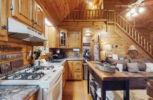 Inside, the cabin features a fully equipped kitchen with all the essentials, including a coffee maker, blender, toaster, and more. The living room is a cozy spot to unwind with a movie on Netflix streaming, while the queen bed ensures a restful night's sleep. With board games and blankets provided, you'll have everything you need for a relaxing stay.