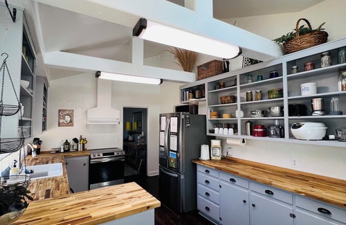 For those who love to cook, our well-appointed kitchen is a chef's delight. It features an eat-in breakfast nook, ample counter space, and a range of appliances including an air fryer, blender, sous-vide, Cuisinart, microwave, and toaster. Prepare gourmet meals with ease or simply enjoy a quick breakfast in this delightful space. Ample pantry items included.