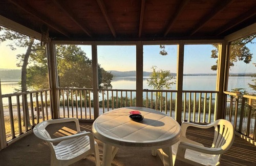 Wake up to wide-open views of Table Rock Lake in this private one-bedroom cabin with screened in porch. Enjoy food at the dining table overlooking the water, cook in the full kitchen, and relax on the deck. Just steps from the dock. Perfect for fishing, boating, or unwinding