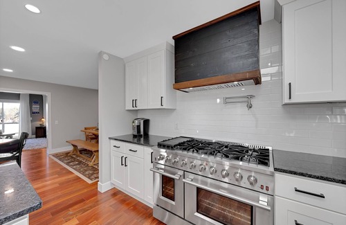 - The fully stocked gourmet kitchen is a chef's dream with an 8-burner stove, double ovens, pot filler, full-size fridge, and separate full freezer, perfect for creating culinary delights while enjoying glimpses of the lake.