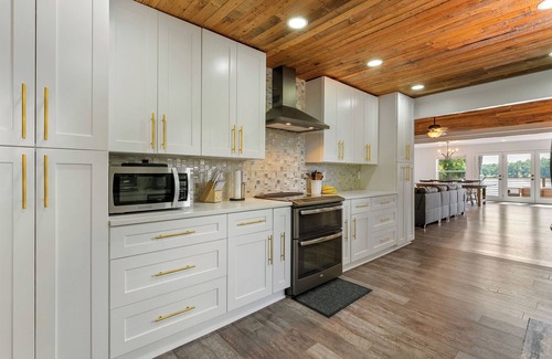 The fully equipped kitchen creates an ideal spot to cook a full-course meal for the entire gathering.