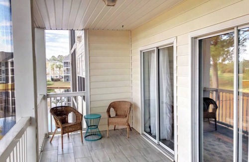 Discover this chic coastal retreat ideally situated near all of Myrtle Beach's top attractions. Unwind with a refreshing swim in the pool just outside your front balcony, or venture a short drive to the beach, boardwalk, and outlet shops. Embrace the mornings on the enclosed patio, relishing the sight of golfers perfecting their swings. This relaxing getaway is ideal for guests aged 21 and above. Nestled in the Windsor Green neighborhood, it's conveniently located only 7 miles from Coastal Carolina University, making it the perfect choice for games and campus visits. With recently replaced floors and a rollaway bed tucked in the master closet, your stay will be both comfortable and memorable. We can't wait to host you and your guests!