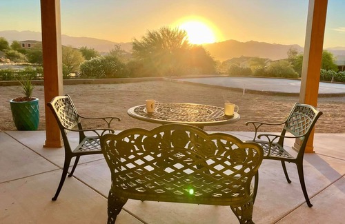 Revel in southwest bliss with this extraordinary foothills residence. The walled courtyard lends privacy and welcomes you to the grand entrance. Once inside, high ceilings, the expansive great room, and oversized windows boast awe-inspiring mountain views. The chef's kitchen, an eat-in area split floor plan, ensuite bedrooms, and expansive covered patios are just some features that foster an indulgent Arizona lifestyle. Golf communities are within minutes. Unbeatable sunrise and sunset view with the endless mountain range while soaking in the hot tub with a glass of wine