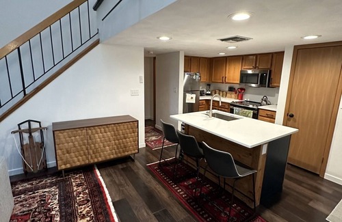 The First level provides a large master bedroom with queen bed, jacuzzi tub, and cable TV. The full kitchen has new countertops and stainless appliances, island seating with adjacent dining room with rustic table and chairs for gathering. The living room has an expansive vaulted ceiling and skylights with great natural light and fireplace for large groups to watch TV or enjoy each other's company. Sleeper sofa in the living room provides extra room for guests. New sliding glass door opens onto a patio outdoor space with a gas grill. Cable TV, DVD Player, and free WiFi throughout. The attached garage is your home for ski and snowboard storage and changing area as well as the provided equipment for your basketball, pickleball, or tennis matches in the summer.